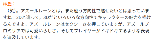 「アズレンとは違う方向性を見せたい。2Dとは違って3Dではキャラの魅力を様々に表現できる。アズレンが“セクシーさ”を重視していたのに対して、アズプロミリアでは“可愛さ”や“プレイヤーをワクワクさせる表情”に焦点を当てている」