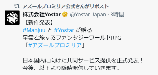 Yostarが日本でそのゲームを出すみたいだね。マンジュウが出すと思ってたんだけど。Yostarはグローバルでも出すのかな?気になるな。